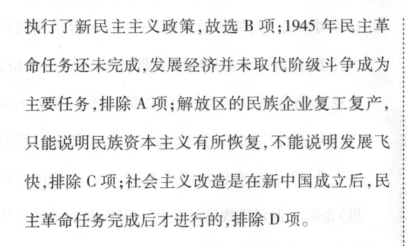 13.B【解析】据材料“1945年8月解放烟台后,中共领导的人民政权迅速将过去被敌伪吞并的企业发还原主,鼓励他们努力经营”,可知党采取积极的措施鼓励民族资本主义的发展,说明在解放区执行了新民主主义政策,故选B项:1945年民主革命任务还未完成,发展经济并未取代阶级斗争成为主要任务,排除A项;解放区的民族企业复工复产,只能说明民族资本主义有所恢复,不能说明发展飞快,排除C项:社会主义改造是在新中国成立后,民主革命任务完成后才进行的,排除D项。金《