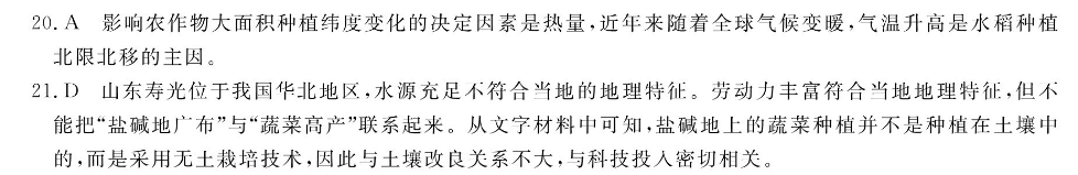 20.A影响农作物大面积种植纬度变化的决定因素是热量,近年来随着全球气候变暖,气温升高是水稻种植北限北移的主因。21.)山东寿光位于我国华北地区,水源充足不符合当地的地理特征。劳动力丰富符合当地地理特征,但不能把“盐碱地广布”与“蔬菜高产”联系起来。从文字材料中可知,盐碱地上的蔬菜种植并不是种植在土壤中的,而是采用无土栽培技术,因此与土壤改良关系不大,与科技投人密切相关。