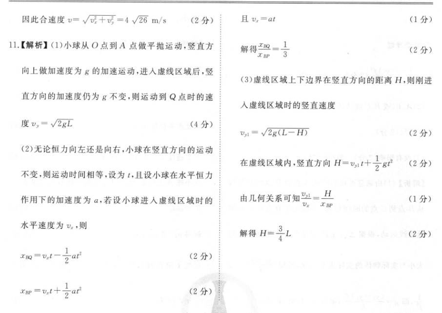 因此合速度v=√+G=4√26m/s(2分)且v,=at(1分)11.【解析】(1)小球从O点到A点做平抛运动,竖直方解得工=1(2分)X BP向上做加速度为g的加速运动,进入虚线区域后,竖(3)虚线区域上下边界在竖直方向的距离H,则刚进直方向的加速度仍为g不变,则运动到Q点时的速入虚线区域时的竖直速度度v,=√2gL(4分)v1=√2g(L-H)(2分)(2)无论恒力向左还是向右,小球在竖直方向的运动在虚线区域内,竖直方向H=1t十282(2分)不变,则运动时间相等,设为,且设小球在水平恒力作用下的加速度为α,若设小球进入虚线区域时的由几何关系可知=H(1分)UxB即水平速度为,则解得H=子2(2分)IBQ =Vt--(2分)x即=U,t十(2分)