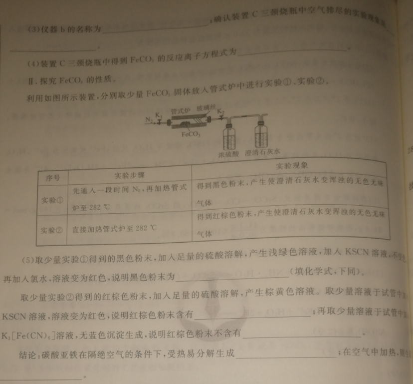 1.(14分)碳酸亚铁(FCO,)与砂糖混用常作补血剂。某实验小组制备碳酸亚铁并对碳酸亚铁的性质进行探究。已知:①FeCO,为难溶于水的白色固体;②Fe+与SCN反应生成无色的[Fe(SCN):]I.FeCO的制备。利用如图所示装置,持续通入过量的CO2至溶液接近中性后,滴加FSO,溶液,得到白色沉淀。再经过洗涤、干燥,得到FeCO,固体。受稀盐酸FeSO,溶液弹簧夹CaCONa2CO带孔澄清石灰水溶液塑料板ABD)装置A中发生反应的化学方程式为2)绘图补充装置B并标明所用试剂:无资C三颈烧瓶中空气排是(3)仪器b的名称为(4)装置C三颈烧瓶中得到FCO,的反应离子方程式为Ⅱ.探究FcCO,的性质利用如图所示装置,分别取少量下C0,周体放人管式炉中进行实验①、实验②,管式炉玻璃丝KFeCO浓硫酸澄清石灰水实验现象序号实验步骤先通入一段时间N:,再加热管式得到黑色粉末,产生使澄清石灰水变浑浊的无色无明实验①炉至282℃气体得到红棕色粉末,产生使澄清石灰水变浑浊的无色无味实验②直接加热管式炉至282℃气体(⑤)取少量实验①得到的黑色粉末,加入足量的硫酸溶解,产生浅绿色溶液,加人KSCN溶液,再加入氯水,溶液变为红色,说明黑色粉末为(填化学式,下同)。取少量实验②得到的红棕色粉末,加人足量的硫酸溶解,产生棕黄色溶液。取少量溶液于试管KSCN溶液,溶液变为红色,说明红棕色粉末含有:再取少量溶液于试管中1K,[Fe(CN):]溶液,无蓝色沉淀生成,说明红棕色粉末不含有结论:碳酸亚铁在隔绝空气的条件下,受热易分解生成:在空气中加热,解析:I,(1)装置A用于制取CO2,发生反应的化学方程式为CaCO,+2HC1一CaCl+C0+H2O.(2)除去CO2气体中的HCI应用盛有饱和碳酸氢钠溶液的洗气瓶。(3)根据仪器的特点,仪器b是恒压滴液漏斗;空气排尽,CO。充满装置,通入装置D中澄水变浑浊。(4)装置C中通入过量的CO,至溶液接近中性,发生反应Na,CO,十CO,+H,0一2a0HCO,浓度增大,抑制CO;水解,降低了OH浓度,防止生成Fe(OHD,。此时溶液中主要NaHC0,再滴加FeS0,溶液,发生反应的高子方程式为Fe十2HCO一FeC0,+0+H2O。Ⅱ.(⑤)使澄清石灰水变浑浊的无色无味气体为C0,气体:合有Fe计的溶液里浅K[Fe(CND]溶液产生蓝色沉淀:遥KSCN溶液不变红色,再加入氧水,溶液支为虹色,Fe的溶液呈棕黄色,遇KSCN溶液变为红色:遏K,[Fe(CN),]溶液不产生蓝色沉淀/(caco,+2Hcccl+cO0()(2分)(2)饱和碳酸氢钠溶液(3)恒压滴液漏斗(1分)装置D中澄清石灰水变浑浊(2分)(4)Fe2++2HCO-FeCO,¥十CO2↑+HO(2分)I.(5)FeO(1分)FeO,(1分)FeO、FeO,(1分任写-种即得分)FeO、CO,(1分)FeO、CO2(1分)