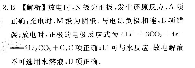 8.B【解析】放电时,N极为正极,发生还原反应,A项正确;充电时,M极为阴极,与电源负极相连,B项错误;放电时,正极的电极反应式为4Li十3C)2十4e一2Ii2CO3十C,C项正确;Ii可与水反应,故电解液不可选用水溶液,D项正确。
