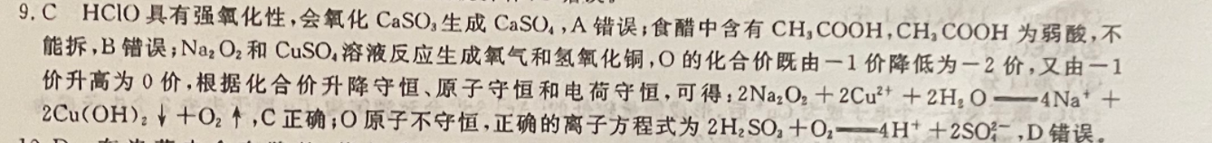 9.C HCIO具有强氧化性,会氧化CaSO,生成CaSO,,A错误,食醋中含有CH,COOH,CH,COOH为弱酸,不能拆,B错误;N2O2和CuSO,溶液反应生成氧气和氢氧化铜,O的化合价既由一1价降低为一2价,又由一1价升高为0价,根据化合价升降守恒、原子守恒和电荷守恒,可得:2Na2O2十2Cu2++2HO一4Na+2Cu(OH)2+O2↑,C正确,0原子不守恒,正确的离子方程式为2H2SO2十O2一4H+十2SO-,D错误