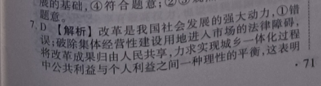 的基础,④符合题意;27D(解析】改革是我国社会发展的强大动力,①错题意提:费除集体经营性安用地进人市场的法脑持改苹成果归由民共为求实现城乡体化式调中公共利益号界人利益之词”种理性的平衡,这表明71群众路线和群众观点是我们的传家宝,也表明符合上层建筑一定要适合经济基础状况的规律,②④符合题意;法律政策的出台属于上层建筑,而不属于生产关系,即材料不是强调符合生产关系一定要适合生产力状况的规律,排除③。