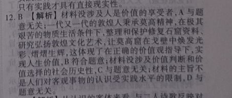 只有实践才具有直接现实性,12.B【解析】材料没涉及人是价值的享受者,A与题意无关;一代又一代的敦煌人秉承莫高精神,在极其艰苦的物质生活条件下,整理和保护修复石窟资料、研究弘扬敦煌文化艺术,让莫高窟在戈壁中焕发光彩、熠熠生辉,这体现了在正确的价值观指导下,实现人生价值,B符合题意;材料没涉及价值判断和价值选择的社会历史性,C与题意无关:材料的主旨不是人们对客观事物的认识受实践水平的限制,D与题意无关。上与一人生欢后地过
