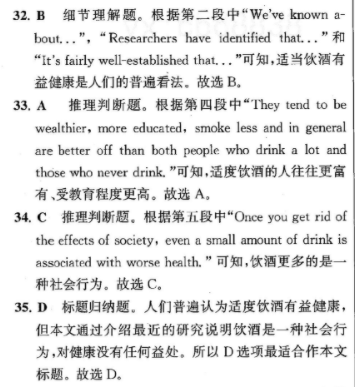 32.B细节理解题。根据第二段中“We've known a-bout..",“Researchers have identified that..”和“It's fairly well--established that..”可知,适当饮酒有益健康是人们的普遍看法。故选B。33.A,推理判断题。根据第四段中“They tend to bewealthier,more educated,smoke less and in generalare better off than both people who drink a lot andthose who never drink."可知,适度饮酒的人往往更富有、受教育程度更高。故选A。34.C推理判斯题。根据第五段中“Once you get rid ofthe effects of society,even a small amount of drink isassociated with worse health.”可知,饮酒更多的是一种社会行为。故选C。35.D标题归纳题。人们普遍认为适度饮酒有益健康,但本文通过介绍最近的研究说明饮酒是一种社会行为,对健康没有任何益处。所以D选项最适合作本文标题。故选D。