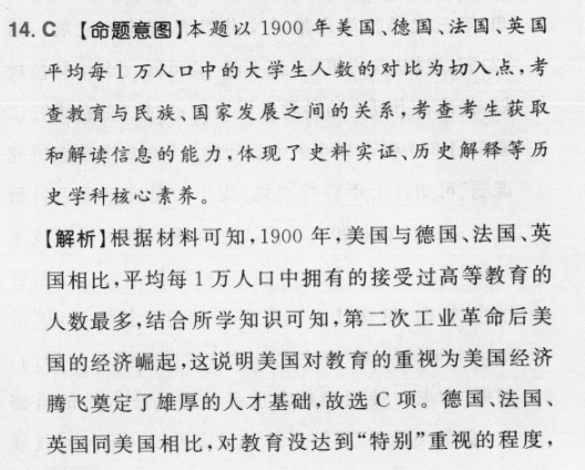 14.C【命题意图】本题以1900年美国、德国、法国、英国平均每1万人口中的大学生人数的对比为切入点,考查教育与民族、国家发展之间的关系,考查考生获取和解读信息的能力,体现了史料实证、历史解释等历史学科核心素养。【解析】根据材料可知,1900年,美国与德国、法国、英国相比,平均每1万人口中拥有的接受过高等教育的人数最多,结合所学知识可知,第二次工业革命后美国的经济崛起,这说明美国对教育的重视为美国经济腾飞奠定了雄厚的人才基础,故选C项。德国、法国、英国同美国相比,对教育没达到“特别”重视的程度,排除A项。一个国家工业化的程度受诸多因素影响,除了教育,还有科技、政府政策等,排除B项。材料未体现普及义务教育,排除D项。图摩金