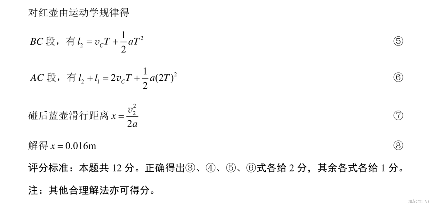 24.(12分)解:(1)设红壶在C点的速度为vc,碰撞后的速度为),蓝壶碰撞后的速度为v2mO=2=0.64①2则v2=0.8vc②红、蓝壶发生碰撞,由动量守恒定律可知m心c=mw,+mw2③联立解得=」④024(2)设壶在滑行过程中的加速度为a,在AB段运动的时间为T,红壶从A到C的过程可以看成是由C到A的匀加速运动激活Wir转到“设置"对红壶由运动学规律得BC段,有l3=vcT+5aT2⑤4c段,有6+4=2,T+a(27⑥碰后蓝壶滑行距离x=⑦2a解得x=0.016m⑧评分标准:本题共12分。正确得出③、④、⑤、⑥式各给2分,其余各式各给1分。注:其他合理解法亦可得分。