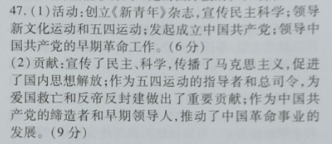 47.(1)活动:创立《新青年》杂志,宜传民主科学:领导新文化运动和五四运动:发起成立党:领导党的早期革命工作。(6分)(2)贡献:宣传了民主、科学,传播了马克思主义,促进了国内思想解放:作为五四运动的指导者和总司令,为爱国救亡和反帝反封建做出了重要贡献:作为党的缔造者和早期领导人,推动了中国革命事业的发展。(9分)