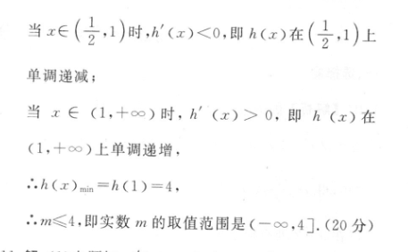 10.解:(1)由题知,f(x)=21-n)由f(x)>0,得0 e,,f(x)的单调递增区间是(0,e),单调递减区间是(e,十∞).(8分)(2)对Vx∈(号,+∞)f(x)≥g(x)-1恒成立,可化为m≤21nx+x+3对Vx∈(2,+∞)恒成立令h(x)=2血x+x+三,则'(x)=2+2红-3x2+3》-D(>号)当x∈(号1)时,h'(x)<0,即h(x)在(2,1)上单调递减;当x∈(1,十oo)时,h'(x)>0,即h(x)在(1,十∞)上单调递增,∴.h(x)mim=h(1)=4,∴.m≤4,即实数m的取值范围是(一∞,4].(20分】