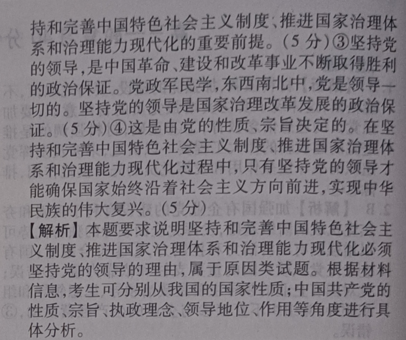 21,①我国是人民民主专政的社会主义国家,人民是国家的主人,在坚持和完善中国特色社会主义制度、推进国家治理体系和治理能力现代化过程中坚持党的领导符合人民的根本利益。(5分)②党是中国最高政治领导力量,办好中国的事情,关键在党。党领导是中国特色社会主义最本质的特征,是中国特色社会主义制度的最大优势,更是坚持和完善中国特色社会主义制度、推进国家治理体系和治理能力现代化的重要前提。(5分)③坚持党的领导,是中国革命、建设和改革事业不断取得胜利的政治保证。党政军民学,东西南北中,党是领导切的。坚持党的领导是国家治理改革发展的政治保证。(5分)④这是由党的性质、宗旨决定的。在坚持和完善中国特色社会主义制度、推进国家治理体系和治理能力现代化过程中,只有坚持党的领导才能确保国家始终沿着社会主义方向前进,实现中华民族的伟大复兴。(5分)金【解析】本题要求说明坚持和完善中国特色社会主义制度、推进国家治理体系和治理能力现代化必须坚持党的领导的理由,属于原因类试题。根据材料信息,考生可分别从我国的国家性质;党的性质、宗旨、执政理念、领导地位、作用等角度进行具体分析。