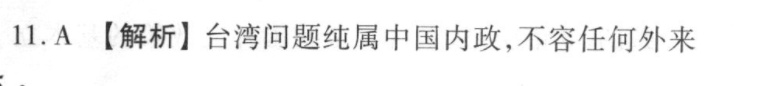 11.A【解析】台湾问题纯属中国内政,不容任何外来干涉,任何人都不要低估中国人民捍卫国家主权和领土完整的坚强决心、坚定意志、强大能力,表明实现祖国的完全统一是中华民族的根本利益所在,也表明互不干涉内政是国际社会的基本准则,①③入选;②④与题意无关,排除。